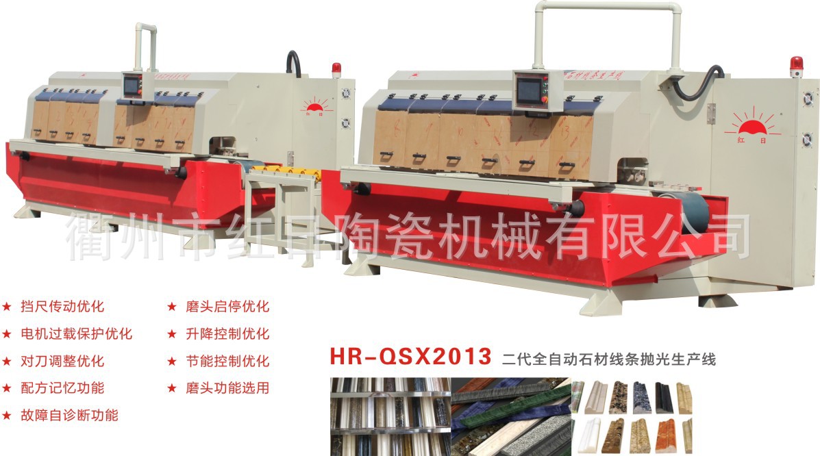 紅日牌全自動(dòng)線條生產(chǎn)線是我廠在多年制造石材機(jī)械和陶瓷機(jī)械的豐富經(jīng)驗(yàn)基礎(chǔ)上,改良研制出來的陶瓷和石材深加工機(jī)械。適用于陶瓷、大理石、花崗石等不同材料,在可設(shè)定程序的微機(jī)協(xié)助下,全自動(dòng)生產(chǎn)各種形狀的裝飾線條。相對(duì)于傳統(tǒng)的手工或半機(jī)械加工方式,取得突破性的提高,具有生產(chǎn)效率高、產(chǎn)品質(zhì)量好、加工成本低等許多新優(yōu)勢。